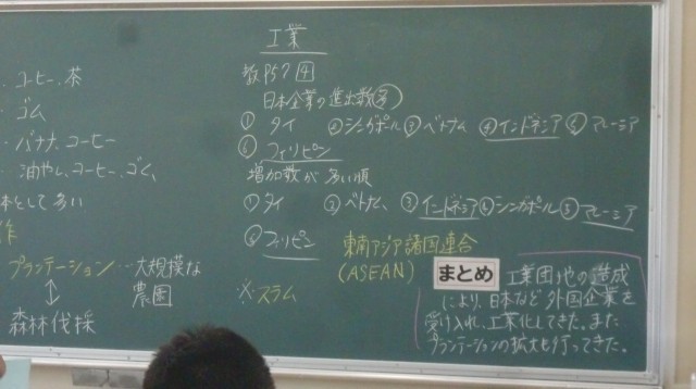 「東南アジアでは、他地域との関わりの中でどのように発展してきたのか」をめあてとして学習していました。フィリピンやベトナム、インドネシア、マレーシアなどの国の農業や工業などについて項目にわけて調べていました。