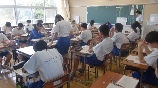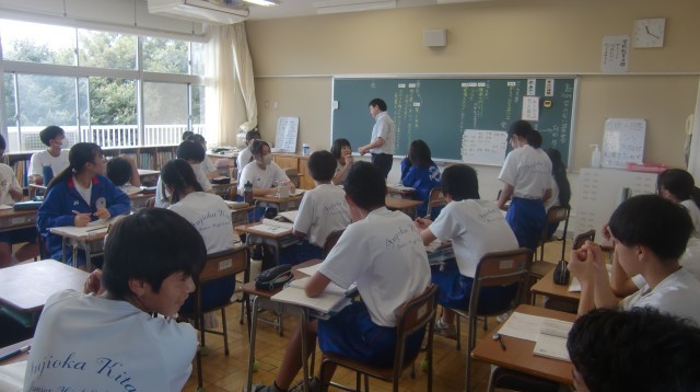 「父への思いを探る」をめあてとして、学習していました。この単元では、一貫して、生徒同士の対話を通して授業が進んでいきます。先生はファシリテーターとなり生徒の発言を整理し、話し合いの方向をコントロールしていきます。黒板にはネームプレートが貼られ、友達の意見と比べながら考えを深めていました。