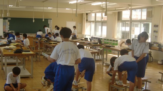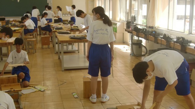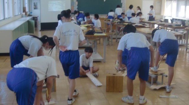 設計も終わり、材料に線を引いて、木材をのこぎりを使って切っていました。材料を足や手でしっかりと固定して、リズムよく切っています。上手に切っている友達の動作も参考にしながら自分で考えて作業を進めていました。