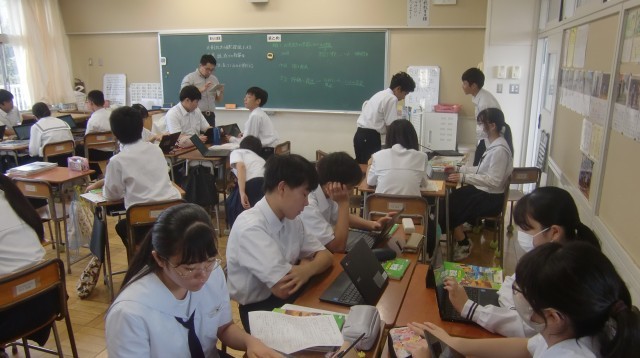 「九州地方の自然環境による産業・経済への影響は、どのようになっているのか調べよう」を単元の目標として、まとめたことを発表しました。各自で調べたことを、グループで説明することで理解を深めました。