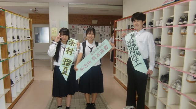 生徒会選挙に向けて、生徒玄関前で、あいさつ運動をしながら選挙活動をしていました。登校する生徒に向けて、爽やかにアピールをしていました。