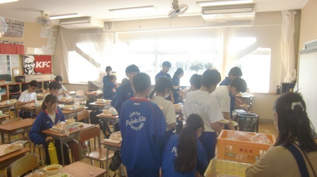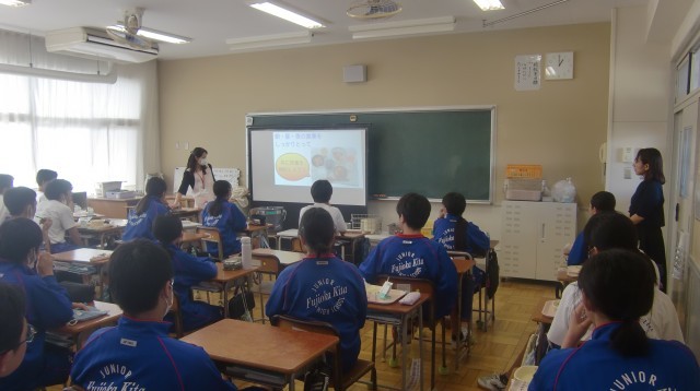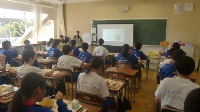 10/2 給食指導について 公開日 2025/10/02 更新日 2025/10/02 できごと 学校給食センターの栄養士さんによる栄養指導がありました。今日は、2年1組と2組で実施していただきました。「しっかりとした体をつくるためには、栄養と睡眠が必要であること」「いつも飲んでいる牛乳の中には、1日に必要なカルシウムの3分の1が含まれていること」な美味しい給食を静かにいただきながら、生徒は興味津々でに話を聞いていました。