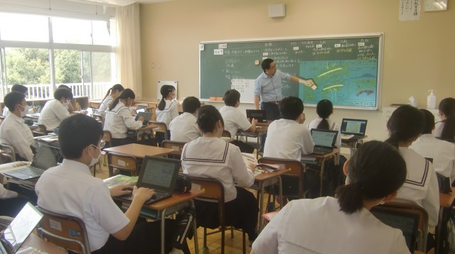 「中国・四国地方の特徴をとらえよう」をめあてとして学習していました。地形や気候など地図やグラフからわかることについて意見交流していました。黒板にはネームプレートが貼られ、関連する内容について整理をしながら授業が進んでいました。