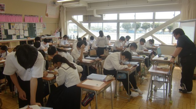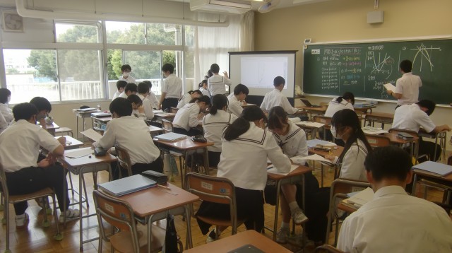 3組では「関数のグラフを利用して問題を解こう」をめあてとして学習していました。一次関数と二次関数の交わった交点を見つけ、それを基に問題を解いていきました。また、2組では生徒同士で教え合いながら問題に向き合っていました。