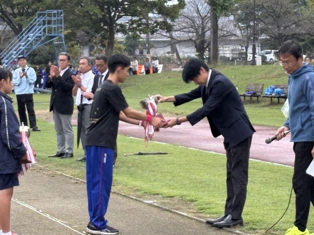 10/4 藤岡多野中体連駅伝大会(閉会式) 公開日 2025/10/06 更新日 2025/10/06 できごと 中体連会長より、北中男子Aチームに優勝カップが授与されました。おめでとうございます。表彰式のあとは、全員で記念撮影をしました。県大会は11月8日(土)渋川市総合運動公園で行われます。また、新たな目標に向かって頑張って行きましょう。会場には保護者の皆さんや3年生の生徒等、多くの方々が応援に駆けつけてくださいました。ありがとうございました。