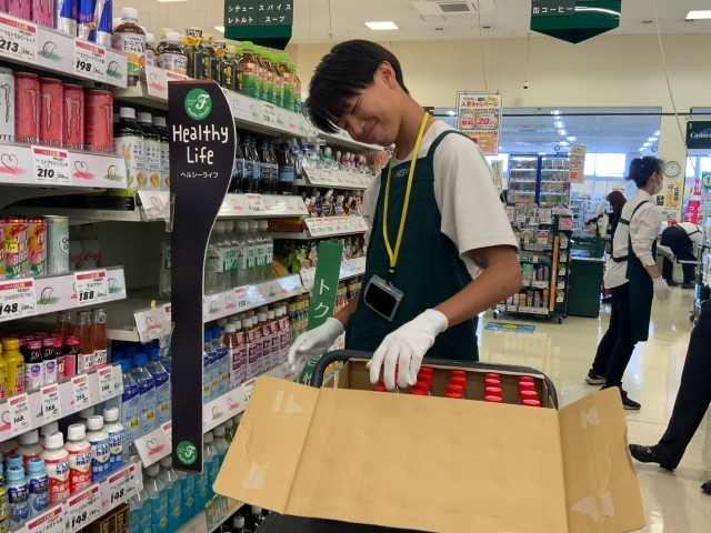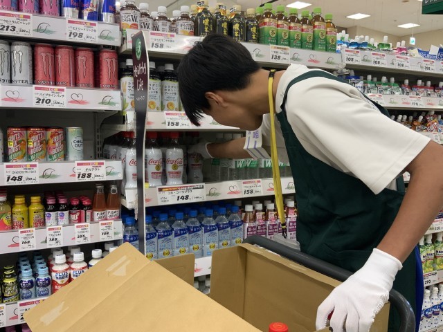 ラベルの向きと1列あたりの本数に気をつけながら、ペットボトルの品出しをしました。