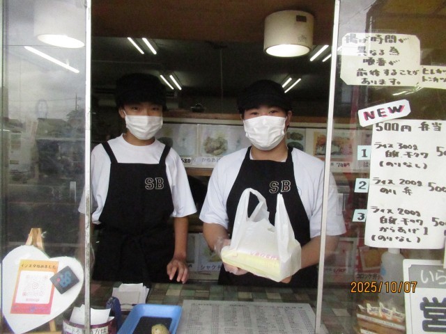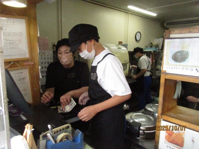 チェレンジウィーク【しあわせ弁当】での体験です。初日から、サラダや焼きおにぎりを作り、店頭に商品が並びました。注文、会計、注文商品作り、品物のお渡しまで体験しています。