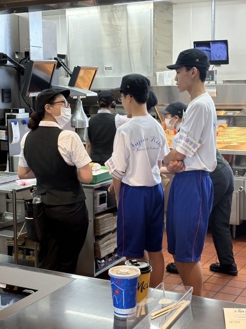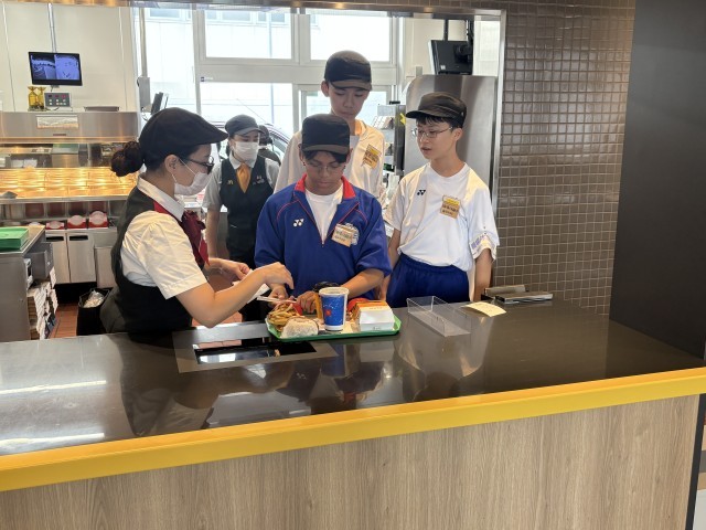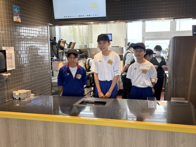 チャレンジウィーク【マクドナルド】での体験です。初日から、フライヤーの前に立ち、フライドポテトを作りました。商品を作る手順、トレーの乗せ方なども教えてもらいました。いい表情で体験しています。