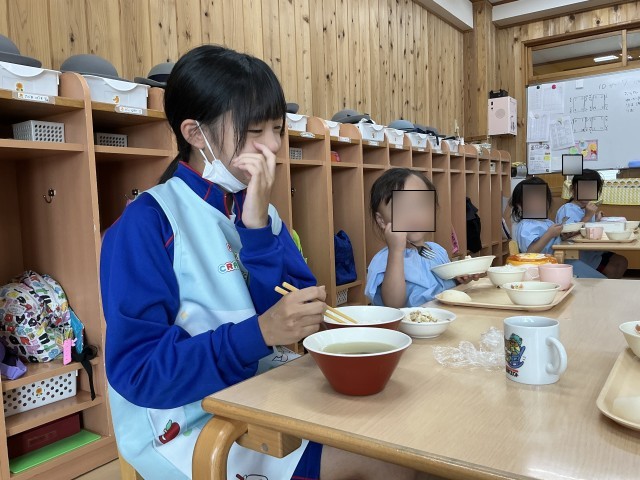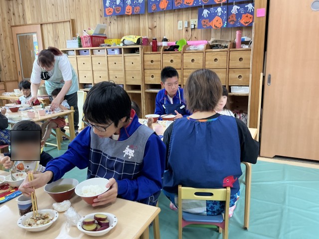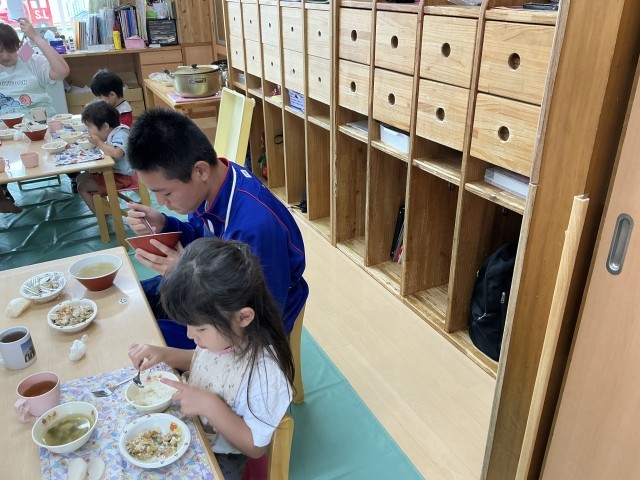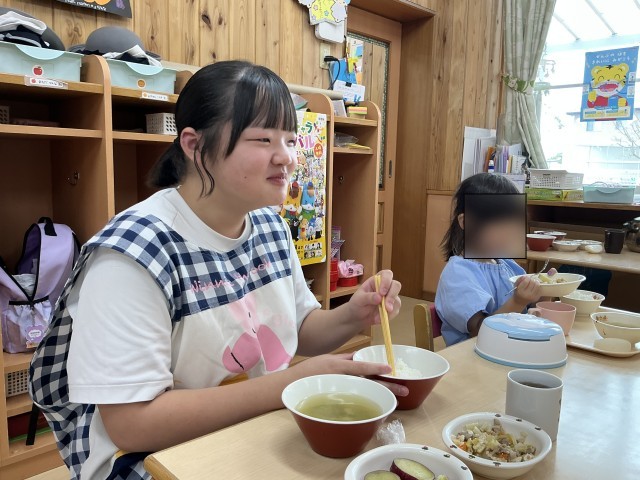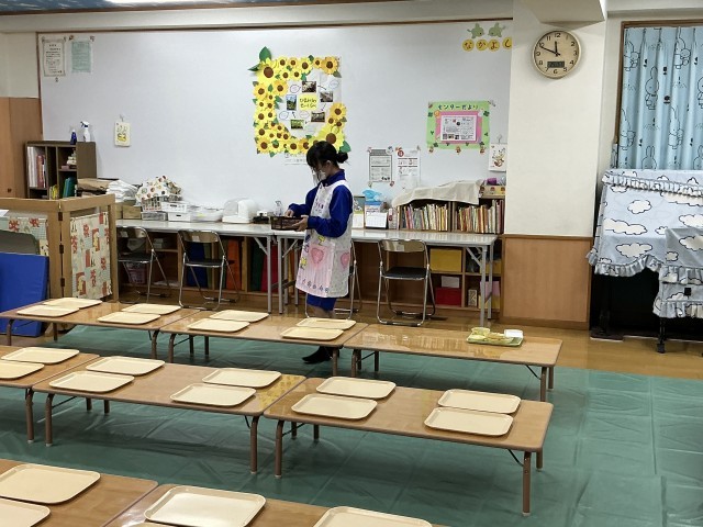 お昼の様子です。準備をして、園児の様子を見ながら食べて、片付けをして…