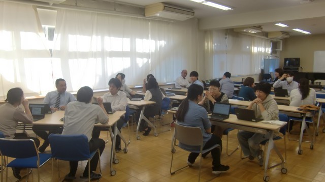 放課後に、先生方の勉強の場である校内研修が行われました。まずは、校内研修主任より、今年4月に3年生を対象に行われた全国学力調査の分析結果や最新の教育動向、授業改善の具体的な内容について説明がありました。その後は、各教科に別れて、学力向上に向けて、どのような取組ができるかについて話し合いがもたれました。