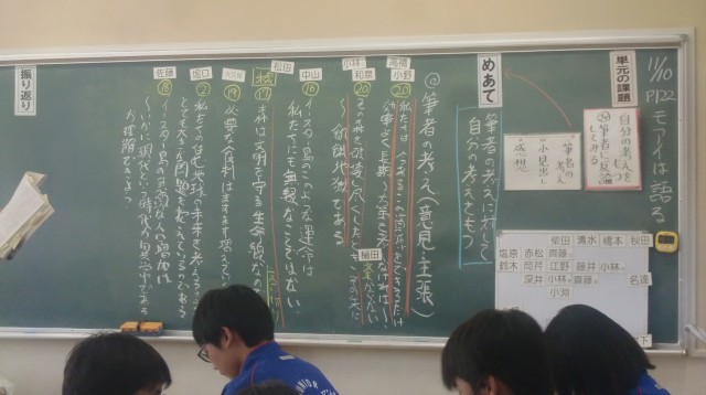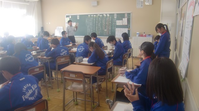 「筆者の考えに対して自分の考えをもつ」をめあてとして学習していました。生徒同士が向き合って座り、相互指名で自分の考えについて発表していました。子どもたちの意見を生かしながら授業が進められていました。