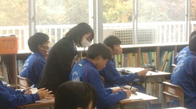 証明の練習問題に取り組んでいました。今まで学習した「三角形の合同条件」を使って、仮定から結論を導いていました。この苦手な生徒も多いですがボランティアの先生も加わりじっくりと理解を深めていきます。