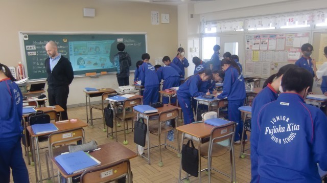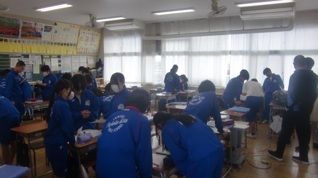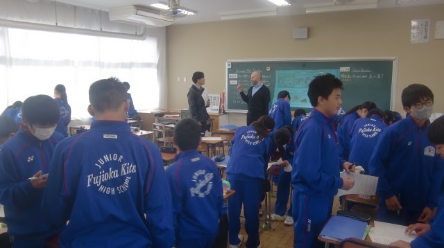 「相手に質問して、選んでもらう時の表現を知ろう」をめあてとして学習していました。これまで、「~していません」「~していますか?」の表現について学んでいます。本時では、「A又はBのどっちが~?」の表現について、友達に質問をしながら、使い方に慣れていきました。