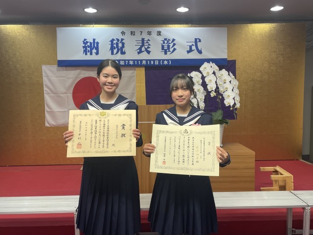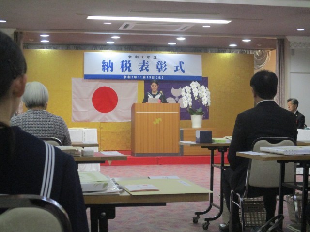 「税についての作文」入賞者の表彰式が行われました。参加した生徒は、たくさんの参加者のみなさんの前で立派に表彰を受けました。中学生が身近な体験から税金のことを考え、自分の意見を述べる姿を、とても頼もしく感じました。