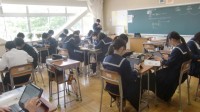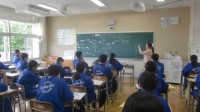 「~していますか?」「~していません。」の表現について学習していました。これまで学習してきた「~しています。」という現在進行形の文をもとに、疑問文を作りました。一般動詞の疑問文では、DoやDoesを文頭につけて疑問文にしますが、ここでは、Be動詞を使って疑問文を作っていました。