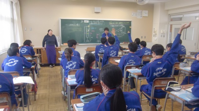 11/25 3年生理科の授業 公開日 2025/11/25 更新日 2025/11/25 できごと 「いろいろな仕事における仕事の原理を考えよう」をめあてとして、斜面を使った仕事について考えていました。ある生徒が前に出て全体に説明をしていましたが、わからなくなってしまったようで、途中から助っ人も加わり、最後まで説明することができました。説明したり、補足をしたりと、学び合いながら理解が深まっていきます。