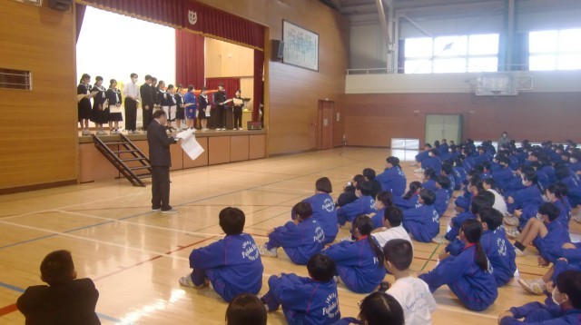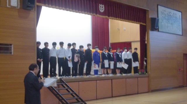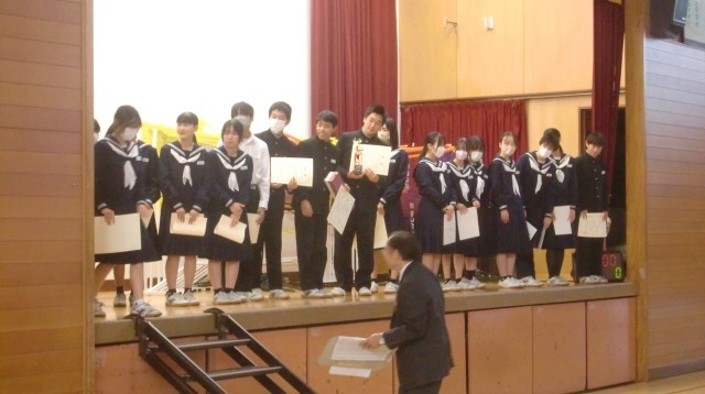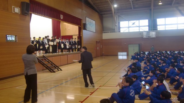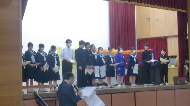 12/1 任命式、表彰 公開日 2025/12/03 更新日 2025/12/03 できごと 1日(月)に生徒会本部役員と後期委員会委員長の任命式と表彰がありました。任命式では、学校をよりよくするためにリーダーとしてしっかりと取り組んでいこうとする前向きな気持ちが伝わってきました。その後は、各種競技、大会の表彰が行われました。たくさんの表彰があり、多方面にわたって取り組んできた生徒たちの頑張りをみんなで讃えました。 +2