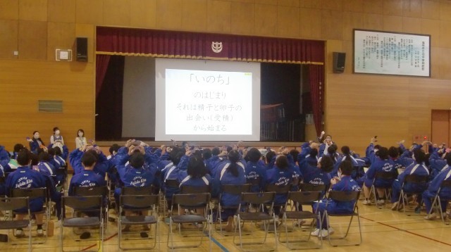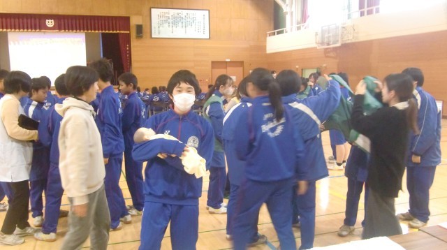 講師に藤岡市の助産師さんや保健師さんをお招きして、生命の誕生やヒトの神秘などについて講話をいただきました。後半には、実際に赤ちゃんの人形を抱いたり、妊婦の疑似体験をしたりと体験活動を通して、生命の誕生するまでの大変さや生まれてきた赤ちゃんとの接し方などを学びました。正しい知識を得たうえで、友達や周りの人たちに対して思いやりの心をもって支え合ったりすることの大切さなど、とても大切なことを学びました。