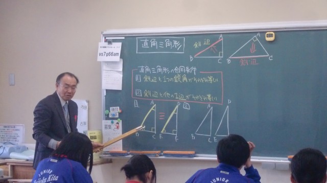 直角三角形の合同条件について、学んでいました。生徒たちは先生の説明をよく聞いていました。ここでは、合同条件をしっかりと理解して、今後の学習に生かしていきます。