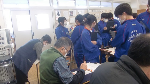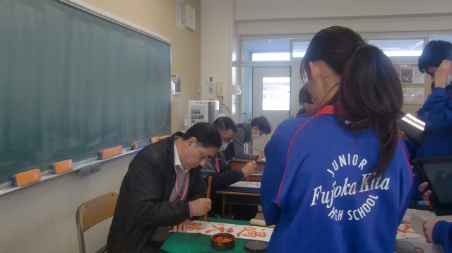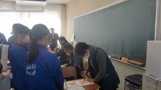 12/4 地域学校協働活動(とらいアングル)ボランティア 公開日 2025/12/04 更新日 2025/12/04 できごと 前回の3年生に続いて本日は2年生の国語の時間に3名のプロの先生から手ほどきしてもらいました。ボランディアさんの丁寧なご指導のお陰で、生徒たちは見違えるほど上手に書けるようになっています。書き初め本番が楽しみです。