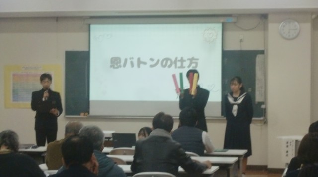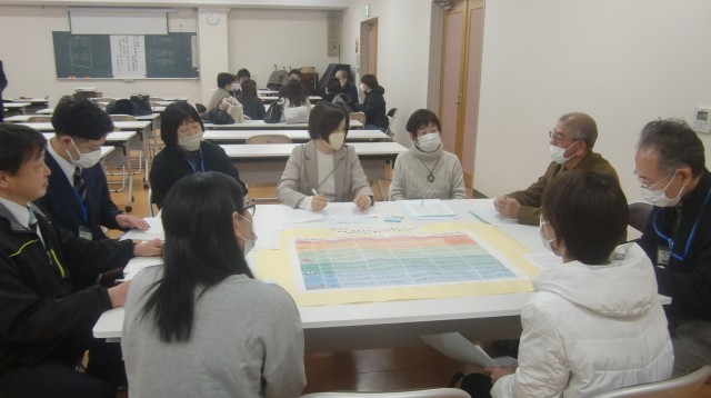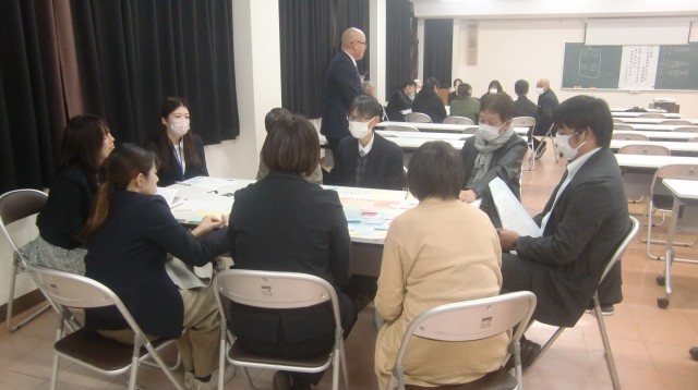 会はまず、本校生徒会によるいじめ防止の取り組みの発表が行われ、続いて第二小学校と神流小学校の取り組みが映像で紹介されました。その後はグループに分かれ、子どもたちとの日頃の関わりの様子や、キャリアアップパワープランとの関連、ボランティア活動などについて情報交換や協議を行いました。