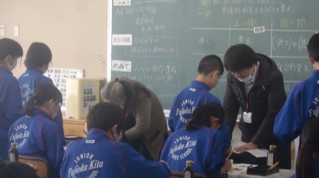 昨日に続いて、3名の講師の先生が来校しました。大きな紙に文字を書く書き初めは難しく、つい集中力が途切れがちになります。しかし、ボランティアの皆様が書いたお手本を見ながら真剣な表情で作品と向き合う姿が見られました。
