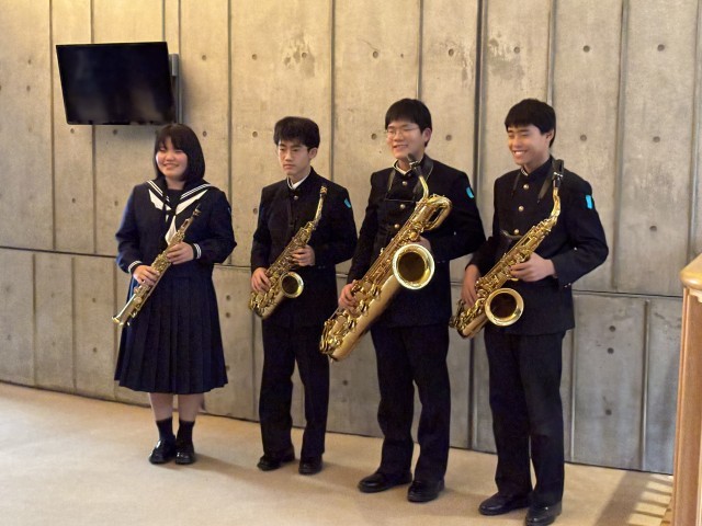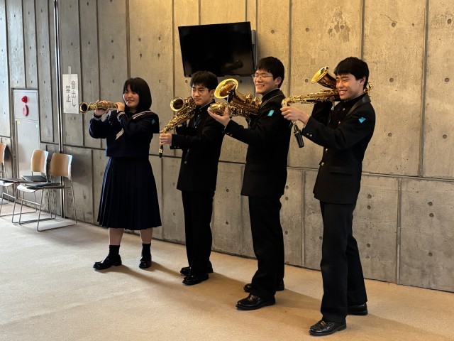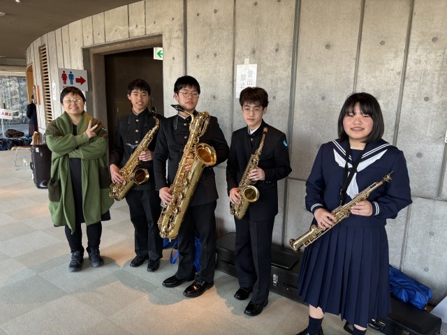 12/13 群馬県アンサンブルコンテスト 公開日 2025/12/14 更新日 2025/12/15 できごと 富岡市かぶら文化ホールで「第49回群馬県アンサンブルコンテスト」が開催されました。本校吹奏楽部より4名の生徒が「サクソフォン」に出場しました。緊張感のある大ホール内のステージ上で、息の合った演奏を披露してくれました。リズムに合わせて堂々と演奏する姿にとても感動しました。どの出場校の演奏もレベルが高くすばらしいものでした。お疲れ様でした。