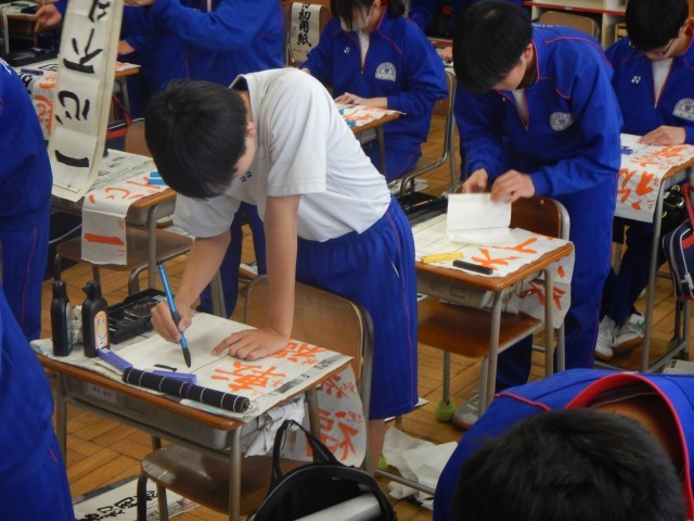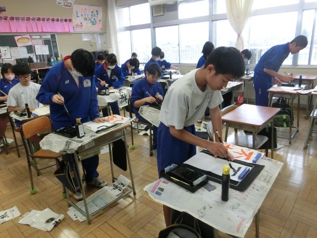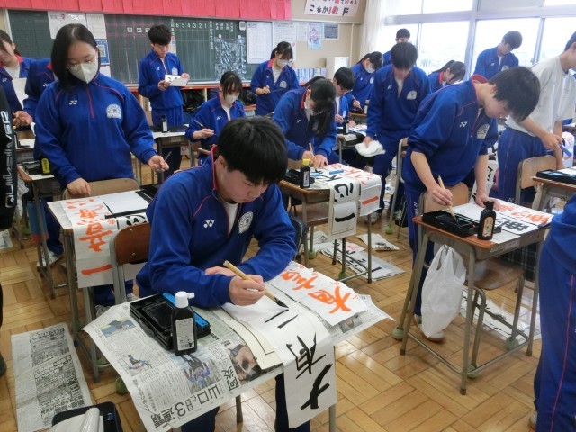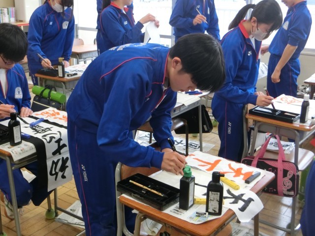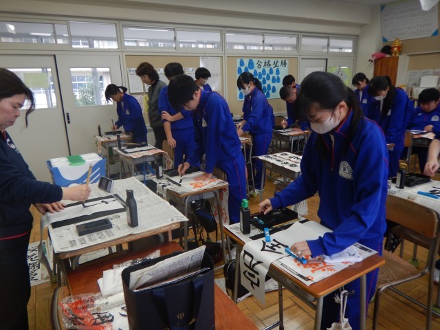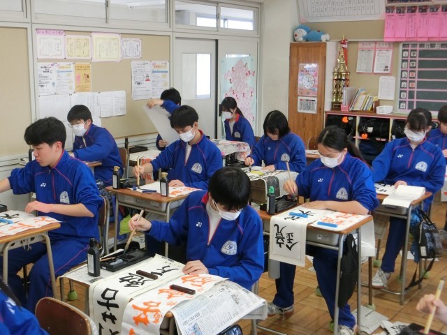 1/7 書き初め大会 公開日 2026/01/07 更新日 2026/01/07 できごと 各学級では書き初め大会が行われていました。静まり返った緊張感のある教室で、書道ボランティアさんに書いてもらったお手本をよく見ながら、納得のいく一枚を仕上げました。すぐに各教室の壁に掲示し、午後審査を行いました。 +3