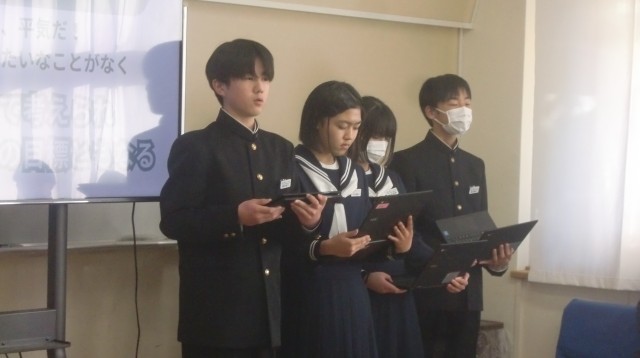 1/13 生徒会スローガンの提案 公開日 2026/01/15 更新日 2026/01/15 できごと 今年度の生徒会スローガンが「アップデート」に決まりました。全校生徒への発表に先駆けて、職員会議で先生方への説明がありました。事前に生徒会役員で何度も練り、それをもとに校長先生に助言をいただきながら完成させた提案は、生徒たちの北中学校への思いが溢れていました。提案の内容については、生徒への発表時にお伝えします。