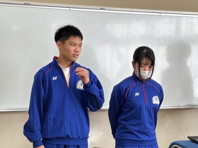 今回の訓練は、「6時間目に怪しい人物が南校舎1階東側から侵入し廊下を歩いているところを、3年1組教員が発見し、侵入者に声かけするが、刃物を持って教室に入ろうとする」という想定で訓練を実施しました。3年1組の生徒が実際に避難をし、侵入者を取り抑えたあとは、教室で教員の対応や刺股の使い方等について、警察の方から指導していただきました。また、場所を西会議室に移して、安全委員会の皆さんが司会進行して、避難訓練全体のまとめを行いました。校長講話、3年1組安全委員生徒の感想、警察署の方より不審者に遭遇してしまった際の対応について、各クラスをオンラインでつないで、振り返りを行いました。