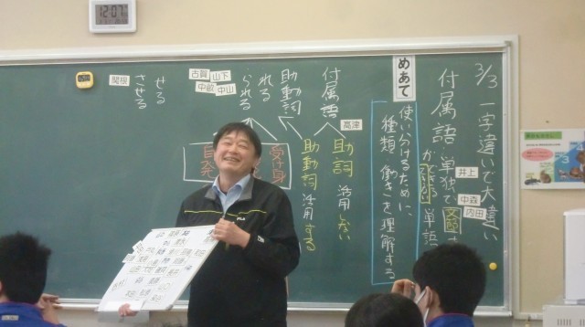 3/3 2年生国語の授業 公開日 2026/03/03 更新日 2026/03/03 できごと 付属語について学習をしていました。付属語とは、「単独で文節を作ることができない単語」であることを確認したあと、具体的な例文をもとに、助動詞について学んでいました。