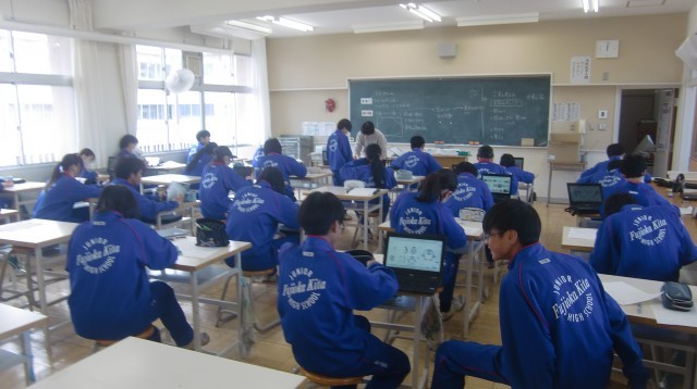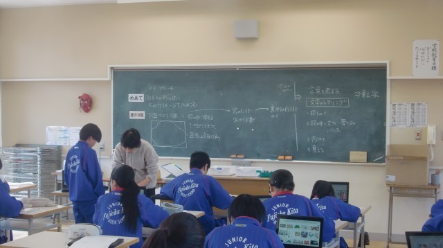 「ひとつの形の中に違うイメージを入れよう」をめあてとして、ドアプレートの図案を考えていました。言葉を考え、文字のレタリング作業も行っていました。みんな集中して取り組んでいます。