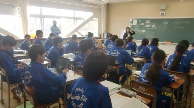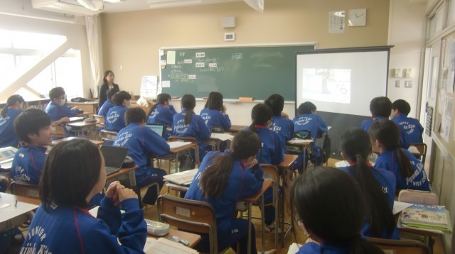 小学校と交流授業をしていました。英会話をしている様子を動画にとり、お互いに見合いました。「中学生はスピードが早くわかりやすい。」「小学校で習った表現を思い出すことができた。」など、それぞれの立場で感想を述べていました