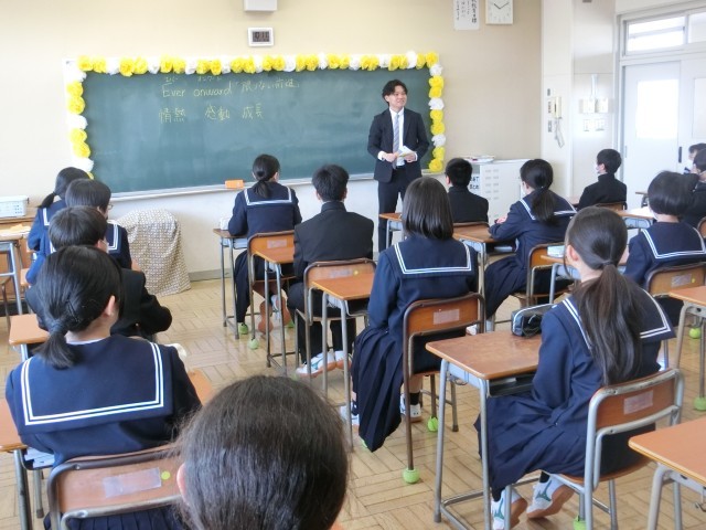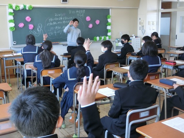 4/8 1年生学級開き 1 公開日 2026/04/08 更新日 2026/04/08 できごと 1年生の学活、学級開きの授業です。黒板には担任の先生の熱い思いが書かれ、和やかな雰囲気で生徒との交流が行われていました。