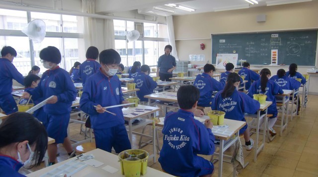 「生活を豊かにする色のコーディネートをする」をめあてとし、授業を行いました。同じ赤でも淡い色から濃い色へだんだんと変かせて、自分の作りたい色に迫っていました。色のグラデーションが鮮やかでした。