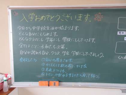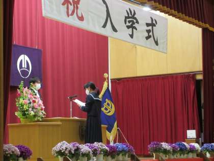 式の中では、新一年生ひとりひとりが担任の先生からの呼名に、希望をもって返事をし、厳粛な雰囲気の中に元気な声が響きました。また、新入生代表の誓いの言葉も素晴らしく、中学校生活にかける大きな期待が感じました。