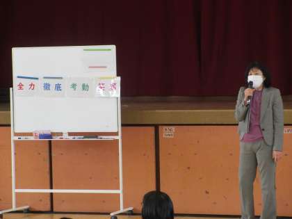8日(木)5時間目、体育館にて2年生が学年集会を行いました。学年主任から「これから新しい学年、新しいクラスをみんなで作っていこう。そのために『全力』『徹底』『考動』『笑顔』を大切にしていこう。そして、生徒会スローガンにあるように『越える』を意識し、昨年の自分を、昨年の2年生をONEチームになって、みんなで越えていこう!」という話がありました。それぞれの学年職員から思いのこもった話があり、2年生のやる気がさらに高まる集会となりました。