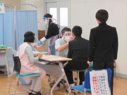 本日、学校歯科医様にお越しいただき、3年生全クラスと2年生2クラスの歯科検診が実施されました。ボランティアの方も2名来てくださり、ビニール手袋の処分や生徒への並び方の指示だしなどをお手伝いしていただきました。校医の先生方は一人一人をとても丁寧に見てくださり、アドバイスなどもしていただくなどして、生徒たちの歯磨きへの意識の向上や口腔環境を良くする気持ちの向上を図っていただきました。