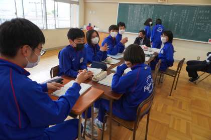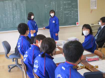 4月14日(水) 生徒会本部役員 公開日 2021/04/14 更新日 2021/04/14 できごと 生徒会室では、本部役員が先日の生徒会オリエンテーションを受けて、新たな取り組みである「先生と仲良くなろうプロジェクト」のまとめ方と「意見箱の活用方法について」協議しているところでした。 「越える」のスローガンのもとで動き出した生徒会本部、SDGSの取組を始め、新しい北中の創造のために果敢にチャレンジしてくれることを期待しています。