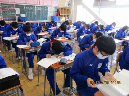 4月15日(木) 3年数学 公開日 2021/04/15 更新日 2021/04/15 できごと 3年生、数学の授業では、展開の公式について学び、後半では、練習問題にチャレンジしていました。さすが三年生、真剣なまなざしで取り組んでいました。
