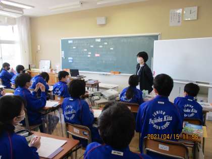 4月15日(木) 2年生理科 その2 公開日 2021/04/15 更新日 2021/04/15 できごと 2年生理科の授業。こちらのクラスでは、新任の先生の指導で「地層からわかることは何か?」考えていました。 新しく来られた先生ですが、黒板には「めあて」「まとめ」「ネームプレート」等が掲示され、すでに北一貫校の授業スタンダードによる授業を進めています。