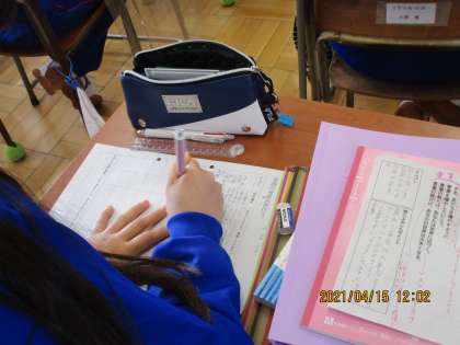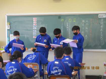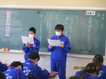 4月15日(木) 1年生国語 公開日 2021/04/15 更新日 2021/04/15 できごと 1年生の国語の授業では、声の大小や強弱、間の取り方や速さなど、読み方を効果的に工夫して音読発表をしていました。 グループで練習をして、前に出て発表していました。 工夫が感じられ、なかなか上手でした。
