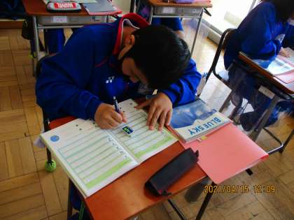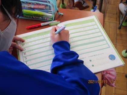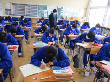 4月15日(木) 1年生英語 公開日 2021/04/15 更新日 2021/04/15 できごと 1年生、英語の授業。こちらの教室では、アルファベットの大文字の練習をしていました。小学校1年生の時に「あいうえお」をノートに練習していた頃を思い出していた人もいたのではないでしょうか? はじめは点線をなぞって、できたら、自分で書いてみる。 小学校の時のコミュニケーションに加え、中学校では「書くこと」が求められてきます。頑張れ1年生。
