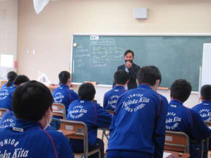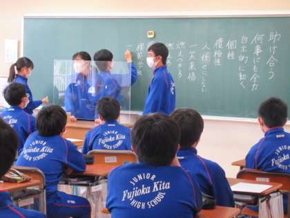 3年生の授業の一場面です。1組の学活では、学級目標の話合いをしていました。「自分たちのクラスを見れば、学年全体が分かるように頑張ろう」という熱い思いが伝わりました。2組の数学では、(X+3)2と(X−3)2を展開し、気付いたことをもとに展開の公式を考える学習に取り組んでいました。とても落ち着いた雰囲気の中、3年生の集中力の高さを感じました。