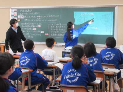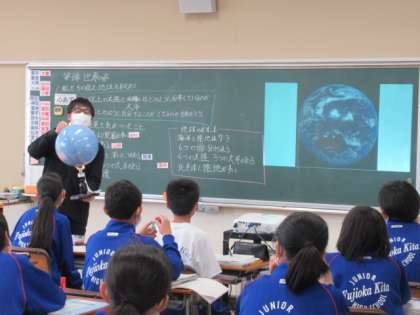 社会では、地球上の大陸と大洋の分布や世界の区分の仕方などを学習しています。社会科では物事を多角的に見る力を養うということを、地球の見え方を例に先生が説明していました。世界の区分や大陸と島の違いなどについて、生徒の活発な発言を生かしながら授業が進められていました。