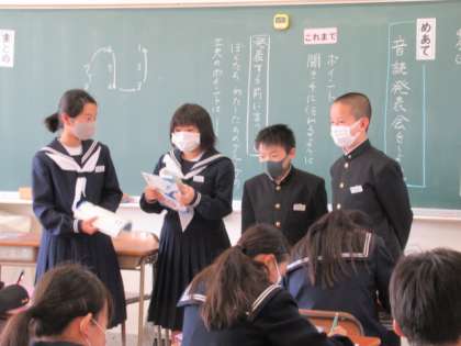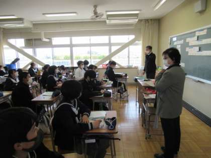 1年生の国語では、『野原はうたう』の音読発表会を実施していました(上)。班ごとに詩の読み方を工夫して練習した成果を披露しています。楽しい読み方、元気な読み方、爽やかな読み方を聞き合い、詩の世界を堪能していました。7組の英語では、音楽を聞き取りながら「Who is your hero ?」「My hero is 〜.」などの学習に取り組んでいました(中)。英語を口にし、ノートに書き、先生や友達と積極的にやり取りして学ぶ姿が見られました。2年生の英語では、ALTの先生とのT・Tで「イースター(復活祭)」を題材にした学習に取り組んでいました。イースターにおいてシンボル的な卵やうさぎの意味などを含め、外国の文化を知る良い機会となりました。