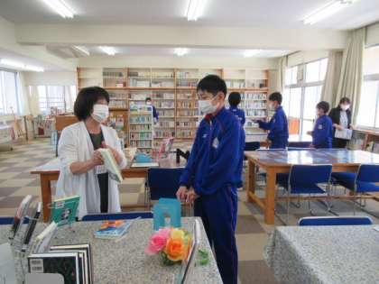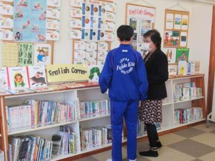 昼休みになると、生徒は校庭や教室、図書室など思い思いの場所で過ごします。図書室では、司書さんがお薦めの本を紹介してくださったり、ALTの先生が自らプロデュースしたEnglish cornerで英語版の絵本などを薦めてくださったりしていました。生徒は興味津々に話を聞き、その後の本選びの参考にしていました。図書室には様々なジャンルの本があります。ぜひ、足を運び、これはと思う本を手に取って読んでほしいと思います。