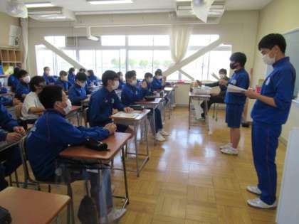 来月に控える修学旅行に向けて、3年生は着々と準備を進めています。実行委員会で話し合ったことをクラスに伝えて共有したり、タブレットPCを使いながらクラス別行動の候補地を吟味したりしています。廊下には、修学旅行のスローガン「しんらい」が大きく貼り出されています(写真下)。学年生徒全員の願いで綴られた“進”という文字のもと、3年生は修学旅行の成功に向けて、着実に日々の学校生活を前進させています。