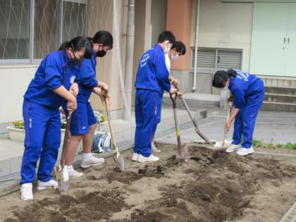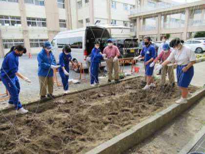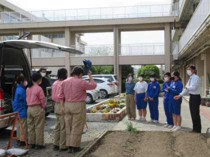 藤岡北高の皆さんと共に(1) 4月22日(木) 公開日 2021/04/22 更新日 2021/04/22 できごと 藤岡北高校の園芸・福祉コースの3年生5名が来校し、7組2年生の野菜の苗植えに協力していただきました。高校生が肥料や苗の準備をしてくれている間、2年生たちが畑の土をスコップで耕しました(写真上・中)。その後、高校生が貸してくれた軍手をはめて、一緒に化成肥料をまきました。作業の仕方を親切に教えてくれる高校生に倣い、2年生たちも一生懸命作業に励みました。
