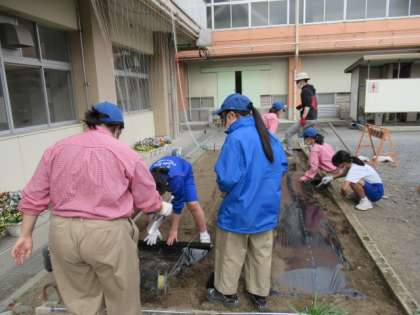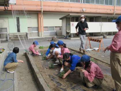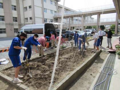 まいた肥料が土とよく絡むように、スコップで隅々まで土おこしをしました。マルチシートをかける場面では、高校生たちが専門的な器具を用いて長さを計測し、2年生にマルチシートのかけ方やシートの端の留め方などを教えてくれました。2年生は、教わったことを忠実に実行するだけでなく、他にできることはないかと積極的に行動していました。どこにどの苗を植えるかについては、高校生がこれまでの実習体験を生かして考えてくれ、ナス、スイカ、ミニトマト、キュウリの苗を植えることができました。